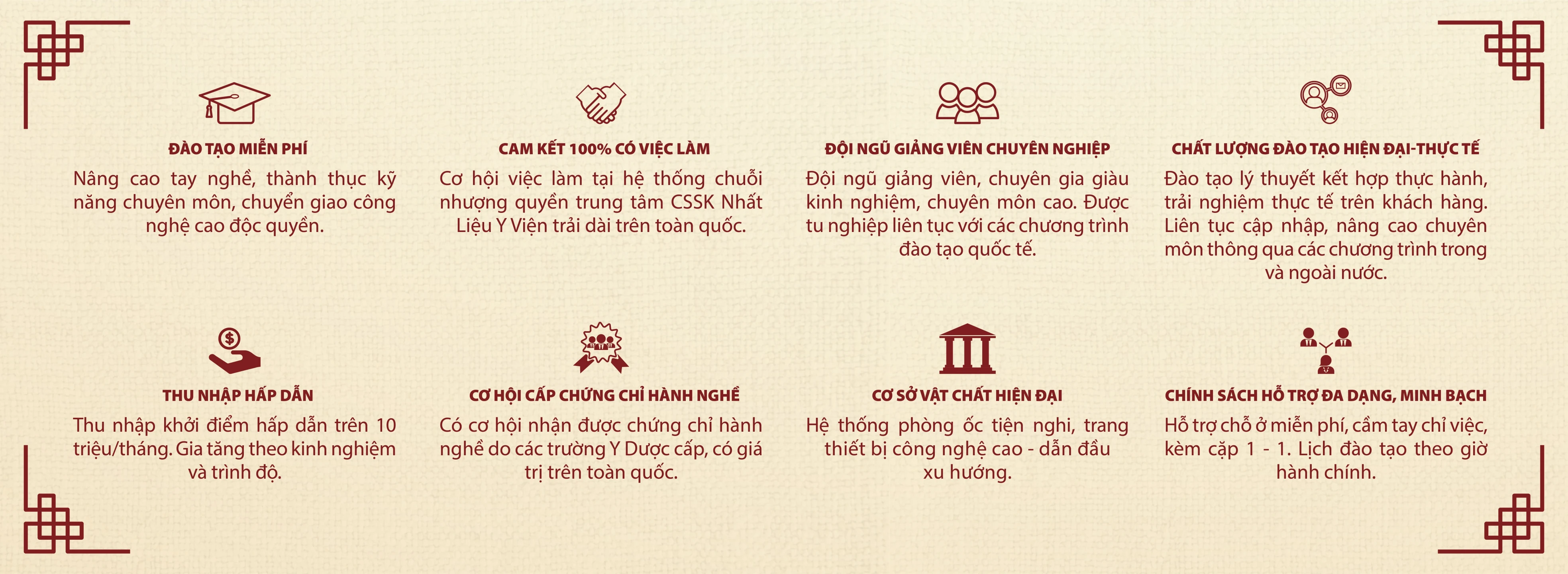 Với thế mạnh vượt trội về công nghệ, Học viện Nhất Liệu Y Viện đảm bảo chất lượng kiến thức vững vàng cùng kỹ năng chuyên môn và kinh nghiệm thực tế sâu sắc. 100% học viên sau khi tốt nghiệp được sắp xếp làm việc trực tiếp tại Hệ Thống Nhượng Quyền Trung Tâm CSSK Nhất Liệu Y Viện trên toàn quốc.