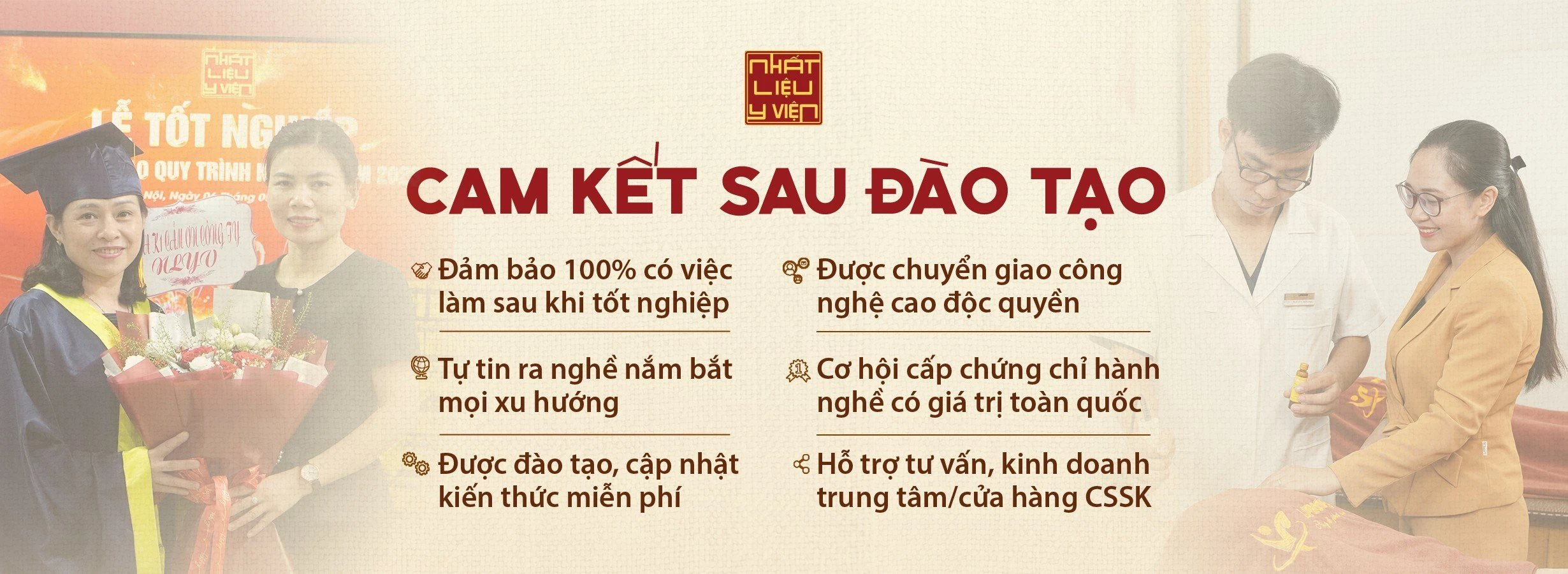 Học viện Nhất Liệu Y Viện tự hào là địa chỉ đào tạo chuyên nghiệp, cung cấp nguồn nhân lực chất lượng cao trong lĩnh vực chăm sóc sức khỏe. Cam kết 100% có việc làm sau khi tốt nghiệp, đảm bảo đầu ra với chất lượng kiến thức vững vàng, nâng cao tay nghề cùng kỹ năng chuyên môn vượt bậc so với các trường đào tạo trên thị trường.