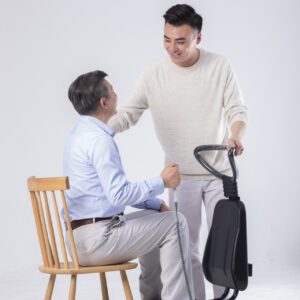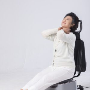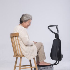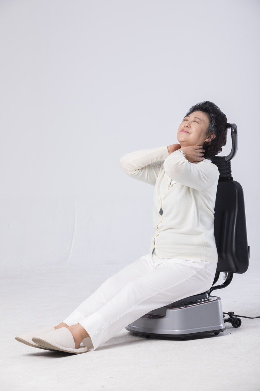 Hỗ trợ bệnh trĩ, vùng chậu đối với nam giới đặt mông lên bàn rung, tựa lưng vào ghế, quay mặt ra ngoài, duỗi chân thẳng.
